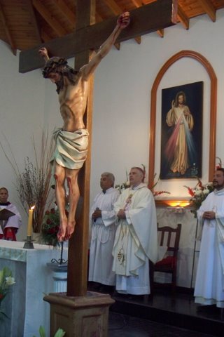 La fiesta popular, que incluyó una procesión orante y festiva encabezada por el cura párroco, R.P. Salatiel, dj y los hermanos del instituto, culminó en el amplio y luminoso templo parroquial, donde la esperaba el obispo Mons. Oscar Sarlinga, el cura párroco de Ntra. Sra. de Luján y Santos Apóstoles Pedro y Pablo de Campana (P. Joaquín Ocampo Álvarez, dj) y el P. Francisco dj., cura párroco de Santa Teresa de Jesús (Garín-Centro). Una multitud se hizo presente, entre los cuales religiosos, religiosas, jóvenes, familias, niños. El Obispo se refirió a la primera lectura de la Sagrada Escritura (Lectura de los Hechos de los Apóstoles 5, 12-16), en especial a los signos y prodigios que acompañaban a los Apóstoles en la comunidad eclesial primigenia, que es la misma Iglesia nuestra, con todos los dones del Espíritu Santo, y a la fama de aquéllos en el pueblo, a la fama de santidad que con toda verdad se daba sobre ellos, al aumento del número de los que creían en el Señor y a la curación de los enfermos, a tal punto que se ponían lo más cerca posible del paso de San Pedro “para que cuando Pedro pasara, por lo menos su sombra cubriera a alguno de ellos”. Asimismo, dijo Mons. Sarlinga, el maraviloso salmo que acabamos de meditar (SALMO Sal 117, 2-4. 22-24. 25-27ª) nos muestra la importancia de la alabanza para tener paz y prosperidad, aún sin ser exentos de sufrimiento o pruebas: “Sálvanos, Señor, asegúranos la prosperidad. ¡Bendito el que viene en nombre del Señor! Nosotros los bendecimos desde la Casa del Señor: el Señor es Dios, y Él nos ilumina”: bendecir y alabar –dijo- liberan el espíritu de “dolores inútiles”, porque nos asocia al único dolor redentor, que es la asociación a la Pasión de Cristo, y a su gloriosa Resurrección. A continuación el Obispo comentó la segunda lectura (Lectura del libro del Apocalipsis 1, 9-11a. 12-13. 17-19) y destacó como San Juan ve “a alguien semejante a un Hijo de hombre, revestido de una larga túnica”, es decir, a Jesucristo, verdadero Dios y verdadero Hombre, en su estado Resucitado, el cual lo primero que le dice al Vidente de Patmos es que no tenga miedo: «No temas: yo soy el Primero y el Ultimo, el Viviente. Estuve muerto, pero ahora vivo para siempre y tengo la llave de la Muerte y del Abismo. Escribe lo que has visto, lo que sucede ahora y lo que sucederá en el futuro», y así, de tal modo, dijo el Obispo que tampoco nosotros debemos tener miedo, porque sólo el Señor Misericordiso “tiene la llave de la historia, del sucederse de los hechos y de los acontecimientos, guiados por su Providencia”, para lo cual –acotó- se requiere una colaboración clave de nuestra inteligencia y voluntad libres. A continuación dijo que el fruto de la presencia de Jesús Resucitado es la verdadera “paz”, que es mucho más que la ausencia de conflicto, es “plenitud” (como lo sugiere la noción judaica de “shalom”). En efecto, el evangelio (Evangelio según san Juan 20, 19-31) manifiesta como Jesús expresa a los suyos un deseo-mandato: «¡La paz esté con ustedes! Como el Padre me envió a mí, yo también los envío a ustedes.» Al decirles esto, sopló sobre ellos y añadió: «Reciban el Espíritu Santo”. Es el Espíritu Santo, precisó, el que nos hace clamar, como el Apóstol Tomás: «¡Señor mío y Dios mío!». “También hoy –comentó Mons. Sarlinga- podemos tener miedo, podemos “mirar al cielo y no tener confianza”, pero, como “Iglesia peregrina”, sabemos que Jesús misericordioso es como el “piadoso Pelícano, cuya imagen tienen Vds. en el frontis de este espléndido altar”, piadoso Pelícano, porque, como narra la leyenda de esta ave, cuando sus hijos están desfallecientes, es capaz de abrirse el pecho para alimentarlos, tanto es el Amor que les tiene, que ha dado la vida por sus hijos, por todos nosotros. Tampoco abandonará a su Iglesia, ni abandonará a nadie que eleve sus ojos a Él pidiéndole paz y el don del Espíritu Santo”.