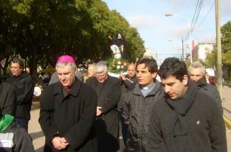 El frío reinante por la mañana no amedrentó a los numerosos participantes de la procesión con la imagen de Santiago el Apóstol, alrededor de la plaza principal, en la cual caminó también el secretario de cultura, Sr. Gallardo, y en el tramo ya junto al arribo a la iglesia se incorporó el intendente municipal, Dr. Carossi. Todos los sacerdotes hicieron la procesión, y así también los diáconos permanentes y los seminaristas de la ciudad (Adrián Lázaro y Francisco Liaudat) Junto al Sr. Obispo y quienes lo acompañaron desde Campana, en la concelebración estuvieron presentes el Pbro. Atilio Rosatte, cura párroco, el Pbro. Fernando Fusari, administrador parroquial de Ntra. Sra. de Luján (Baradero) y los diáconos Ricardo Dib (adscripto a Santiago Apóstol) y Carlos Roselló (adscripto a Nuestra Señora de Luján).