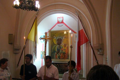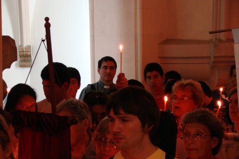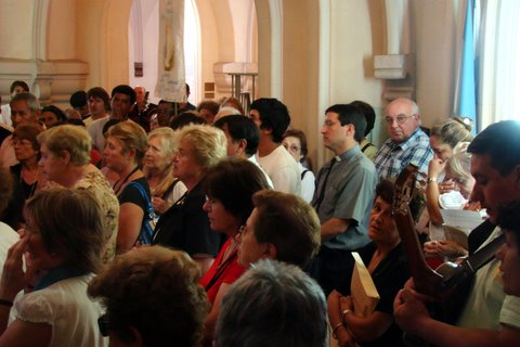 Procesionalmente y al son del canto de “Virgencita de Luján” los peregrinos se trasladaron a la Basílica, donde participaron de la santa misa a las 17.00. Por pedido del obispo Mons. Oscar Sarlinga, el Pbro. Dr. Néstor Villa tuvo a cargo la homilía. Los jóvenes de la “Comunità Cenacolo” (de recuperación de tóxico-dependientes tuvieron a su vez el misterio en la capilla de Ntra. Sra. Aparecida y el canto del “Stella Polare”.